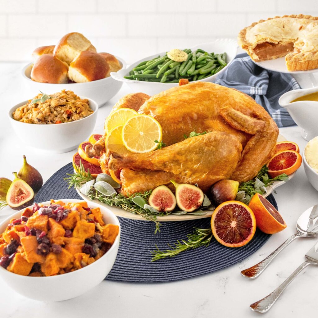 Mollies Roasted Turkey (Turkey, Turkey broth, contains 2% less of potassium lactate, salt, sugar, sodium phosphate, sodium diacatate, flavorings), Mashed Potatoes (Potatoes, Milk, Butter (sweet cream, salt, annatto), Salt, Nisin Preparation), Gravy (Turkey Stock (Turkey, Carrot, Yellow Onion, Salt, Spices), Flour Unbleached (Enriched Wheat Flour, Niacin, Reduced Iron, Thiamine Mononitrate, Riboflavin, Folic Acid, Malted Barley Flour), Butter, Salt), Vegetable Base (Carrot, Celery, Onion, Onion, Red & Green Bell Pepper, Onion), Juices (Onion, Garlic, Shallot, Carrot), Sugar, Salt, Yeast Extract, Corn Protein, Contains 2% Or Less Of The Following: Maltodaxtrin, Canola Oil, Natural Flavor, Disodium Inosinate, Disodium Guanylate, Modified Food Starch, Spice, Soy Protein, Burgundy Wine), Garlic, Canola Olive olive Oil Blend, Herbs, Black Pepper), Bread Stuffing (Enriched Flour (Wheat Flour, Barley Malt, Niacin, Iron, Thiamine Mononitrate, Riboflavin, Folic Acid), Water, Celery, Onion, Soybean Oil, Butter, Mushroom, Carrot, Sage, Thyme, Rosemary, Turkey Stock, Natural Flavor, Turkey Fat, Maltodextrin, Salt, Pepper, Sugar, Yeast Extract), Cranberry Sauce (Cranberries, Cane Sugar, Water, Orange Juice Concentrate (concentrated orange juice, water, orange pulp, natural flavors), Modified Cornstarch, Cultured Dextrose, Sea Salt, Spices), Dried Cranberry, Golden Raisins, Kale Garnish. Contains: Milk, Wheat, Soy.