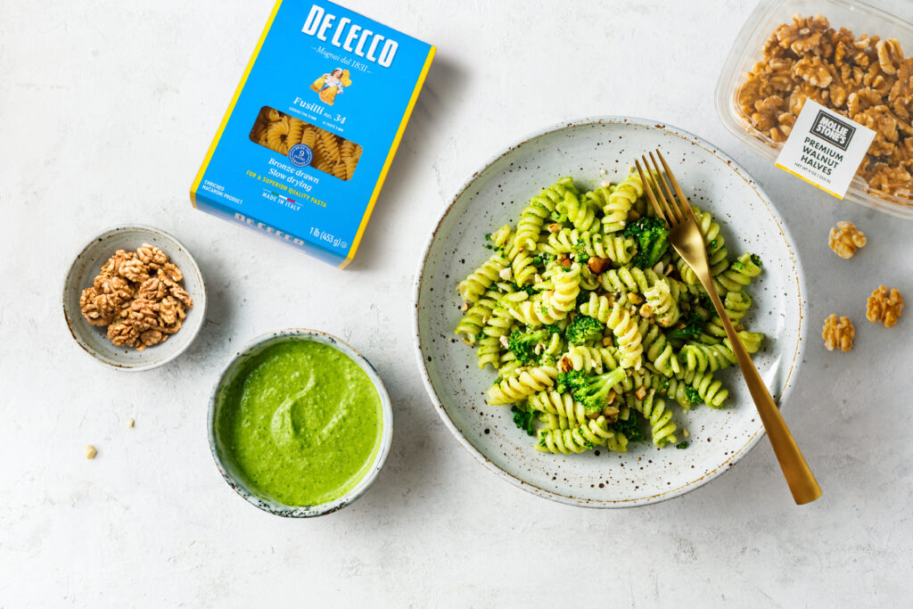 - Make the Pesto: In a food processor or blender, combine the California walnuts, fresh basil, olive oil, lemon juice, garlic, salt, and pepper. Blend until smooth and creamy, adding more olive oil if needed for consistency.